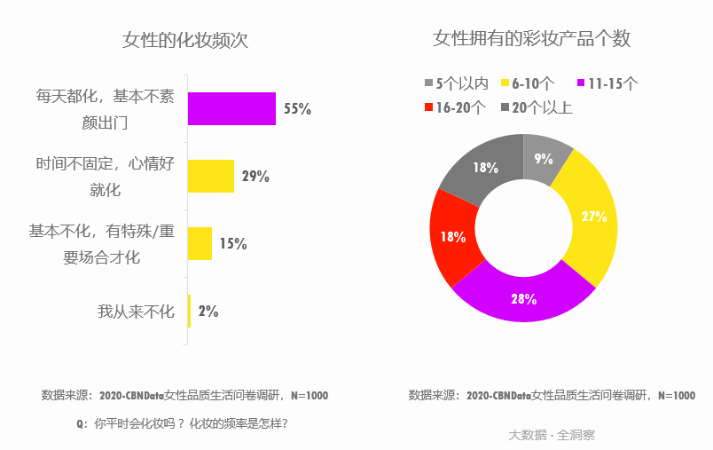 CBNData《報(bào)告》顯示,越來(lái)越多的女性開(kāi)始關(guān)注對(duì)自己外在形象的話(huà)語(yǔ)權(quán),近年來(lái)彩妝消費(fèi)需求強(qiáng)勁。55%的女性每天化妝,64%的女性擁有10件以上的化妝品。