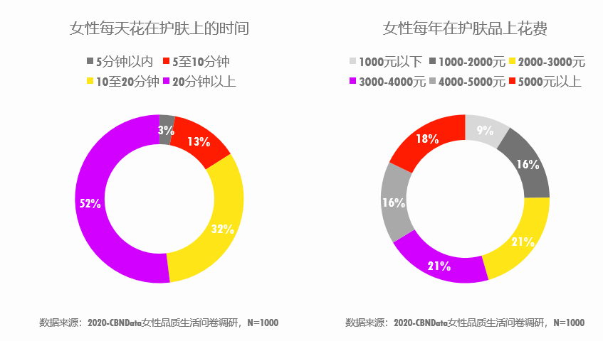 CBNData《報(bào)告》指出,近兩年內(nèi),護(hù)膚、口服美容等與顏值相關(guān)的品類(lèi)帶動(dòng)萬(wàn)億級(jí)的消費(fèi)增長(zhǎng),其中洗臉儀、按摩儀、蒸臉儀等高科技美容儀備受青睞。55%的女性每年護(hù)膚品花費(fèi)超過(guò)3000元,超過(guò)半數(shù)的女性每天花在護(hù)膚上的時(shí)間超過(guò)20分鐘。