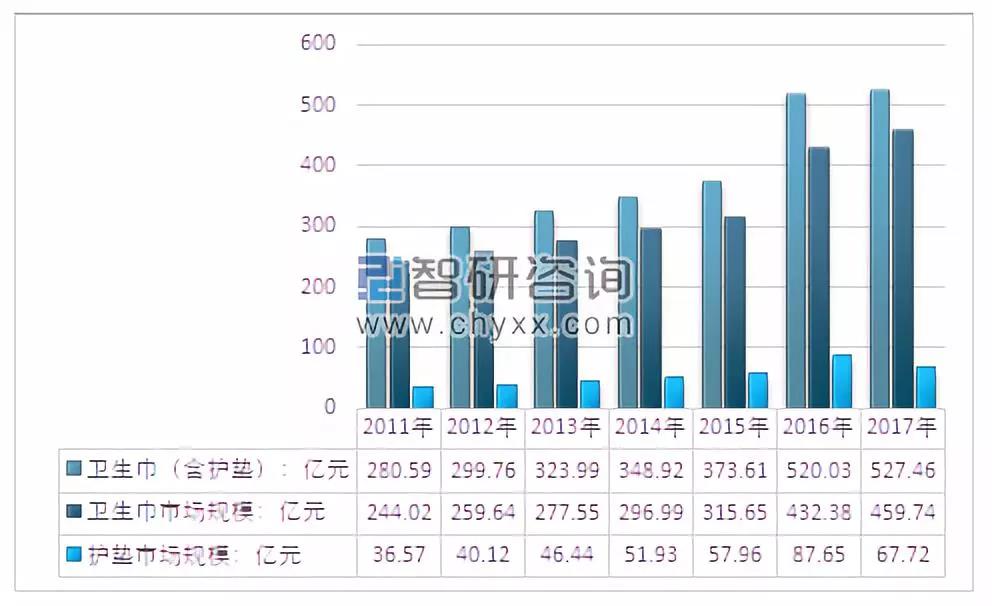 根據(jù)中國造紙協(xié)會生活用紙專業(yè)委員會的數(shù)據(jù),2011 年至2017年,衛(wèi)生巾(含護(hù)墊)消費(fèi)量從839.6億片增加到1200.1 億片,市場規(guī)模從280.59億元擴(kuò)大至527.46億元。