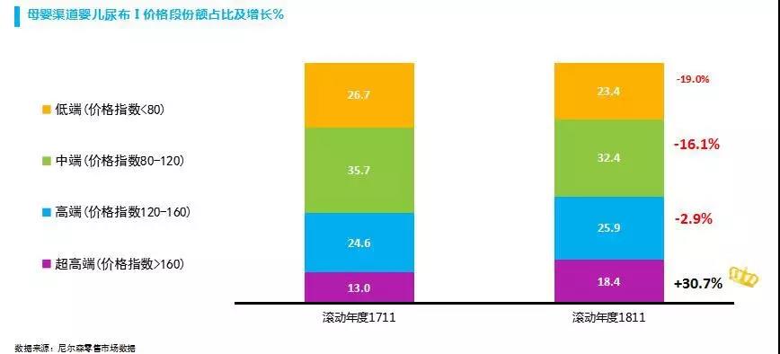 2018年紙尿褲市場(chǎng)最明顯的變化是,多年來(lái)固化的內(nèi)外資品牌格局正在被打破,從花王、好奇、幫寶適、尤妮佳、大王為代表的外資大牌紙尿褲發(fā)展態(tài)勢(shì)來(lái)看,花王和好奇紙尿褲在大幅下滑,尤妮佳開(kāi)始超越花王,幫寶適借一級(jí)幫觸底反彈,大王紙尿褲正處上升盛世,不過(guò)增長(zhǎng)壓力、控價(jià)壓力越來(lái)越大。與此同時(shí),高端紙尿褲市場(chǎng)出現(xiàn)突破機(jī)會(huì)。從尼爾森零售市場(chǎng)數(shù)據(jù)來(lái)看,2018年160元以上超高端價(jià)位的紙尿褲銷售額增長(zhǎng)超30%,對(duì)比鮮明的是,中低端紙尿褲市場(chǎng)下滑嚴(yán)重。目前紙尿褲市場(chǎng)中,進(jìn)口有機(jī)材質(zhì)、日夜用等細(xì)分概念,以及適合寶寶運(yùn)動(dòng)的拉拉褲在引領(lǐng)行業(yè)增長(zhǎng),尤其是三四線城市增長(zhǎng)迅速。