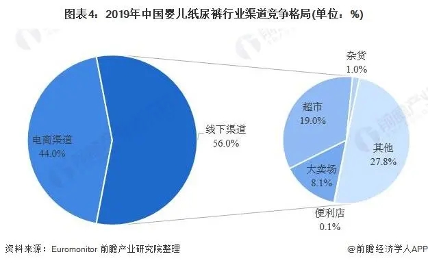 隨著互聯(lián)網(wǎng)以及網(wǎng)購的流行,電商渠道的銷售占比不斷提升,嬰兒紙尿褲電商渠道銷售占比從2010年的4.8%迅速增長至2019年的44%,而以超市、大賣場等為代表的線下渠道銷售額占比從2010年的95.2%減少至2019年的56%。