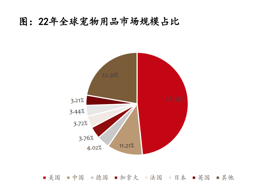從國家層面來看,目前美國寵物用品市場規(guī)模排名第一,2022年美國寵物用品市場規(guī)模高達(dá)230.04億美元,占全球市場份額的48.33%。中國寵物用品市場規(guī)模僅次于美國,2022年市場規(guī)模為53.45億美元,占全球市場份額的11.21%;英國、德國、日本、法國、加拿大也是重要的寵物用品消費市場,根據(jù)歐睿國際的數(shù)據(jù),22年德、加、法、日、英的寵物用品的市場份額分別為4.02%、3.76%、3.72%、3.44%、3.21%。
