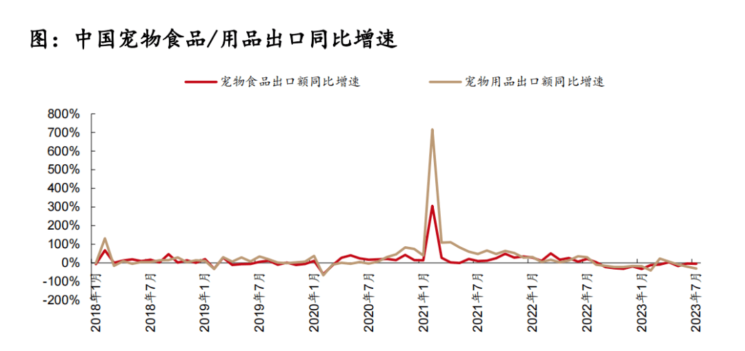 2023年1-6月寵物用品分別同比增長-18.06%、-40.84%、22.98%、6.51%、-9.5%、-20.86%,1-7月累計同比增長-15.58%。