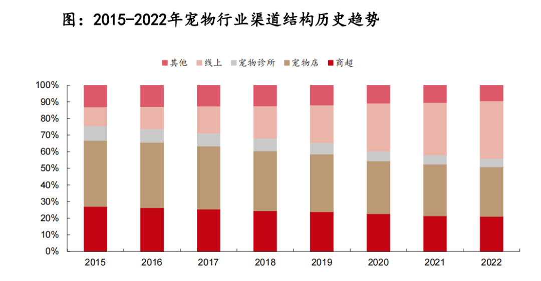 從渠道端來看,隨著電商平臺的高速發(fā)展,寵物用品銷售渠道線上化強(qiáng)勢。寵物用具銷售渠道豐富,線下銷售渠道可細(xì)分為商超、寵物店、寵物醫(yī)院診所等渠道,