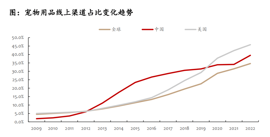 隨著電商平臺的迅猛發(fā)展以及線上購物的便捷性,寵物用品線下銷售渠道占比有所下降,而線上渠道占比持續(xù)提升。根據(jù)歐睿國際的數(shù)據(jù)顯示,全球?qū)櫸镉闷肪€上渠道占比由2013年的7.7%增長至2022年的34.6%,13-22年規(guī)模CAGR高達(dá)18.17%。