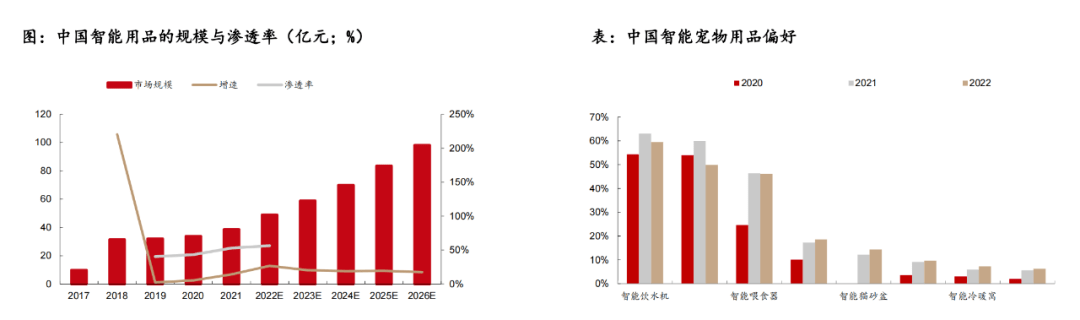一是智能化:數(shù)據(jù)顯示,2017-2021年中國寵物用品市場規(guī)模分別為9.8、31.4、32.1、33.8、38.6億元,2017-2019年CAGR高達(dá)40.9%,預(yù)計到2026年,寵物智能用品有望達(dá)到98.1億元。