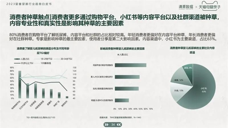 根據(jù)白皮書(shū)數(shù)據(jù)統(tǒng)計(jì),80%消費(fèi)者在購(gòu)物平臺(tái)了解紙尿褲,內(nèi)容平臺(tái)和社群的占比相對(duì)較高。年輕消費(fèi)者更偏好在內(nèi)容平臺(tái)種草,年長(zhǎng)消費(fèi)者更偏好在社群種草。專(zhuān)家是影響種草的最主要因素,使用者分享是第二大影響因素。內(nèi)容渠道中,小紅書(shū)為主要渠道,占比63%。