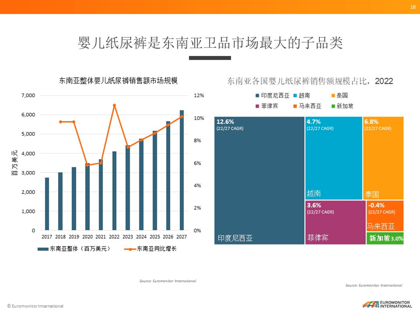 眾多紙尿褲品牌對(duì)東南亞市場(chǎng)情有獨(dú)鐘背后,是可觀(guān)的市場(chǎng)前景。根據(jù)Euromonitor(歐睿信息咨詢(xún))數(shù)據(jù)顯示,2022年?yáng)|南亞一次性衛(wèi)品市場(chǎng)整體零售額達(dá)到了65億美元,其中嬰兒紙尿褲是東南亞衛(wèi)品市場(chǎng)最大的子品類(lèi),去年市場(chǎng)規(guī)模超過(guò)了40億美元,21-22年同比增長(zhǎng)達(dá)到將近11%。預(yù)計(jì)2027年嬰兒紙尿褲市場(chǎng)會(huì)超過(guò)60億美元。